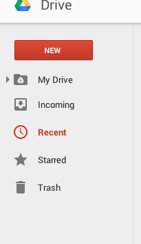 On the left hand side you will see your navigation tools: your My Drive Folder (with a drop-down arrow to access all the folders you create), your Incoming (for files shared with you), Recent (where you can quickly access the documents you’ve worked on most recently), Starred (you can mark important documents with a “star” for quick access), and Trash (where documents you delete are stored for 30 days or until you empty the trash).