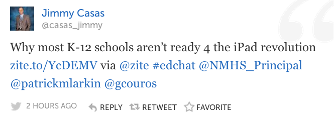Being one of the first schools in our region to go all in on iPads at the high school level, I am always interested in reading the perspectives of others on this topic. I think that there are a number of questions that need to be addressed for schools thinking about increasing the number of devices in their classrooms or moving towards a 1:1 program. The post referenced in the tweet by my friend Jimmy, a high school Principal in Iowa, is worth a read for people looking at investing in iPads (or going 1:1 with any device).